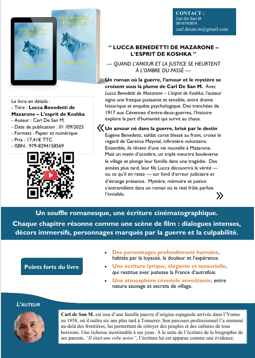 Lucca Bénédetti de Mazarone – L’esprit de Koshka : C’est un roman fiction, une intrigue criminelle avec suspense. Une enquête au long court qu’entreprend Lucca. Disponible sur Amazon.